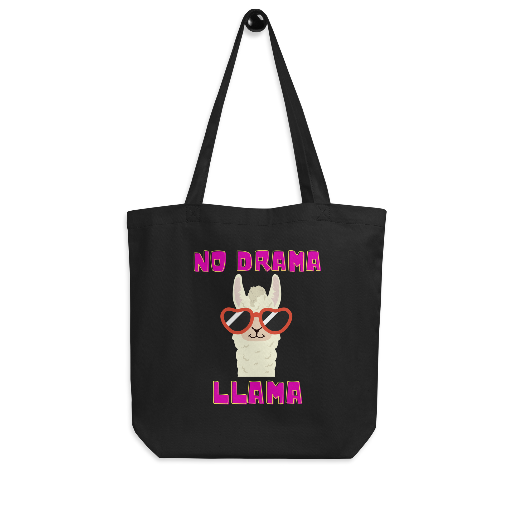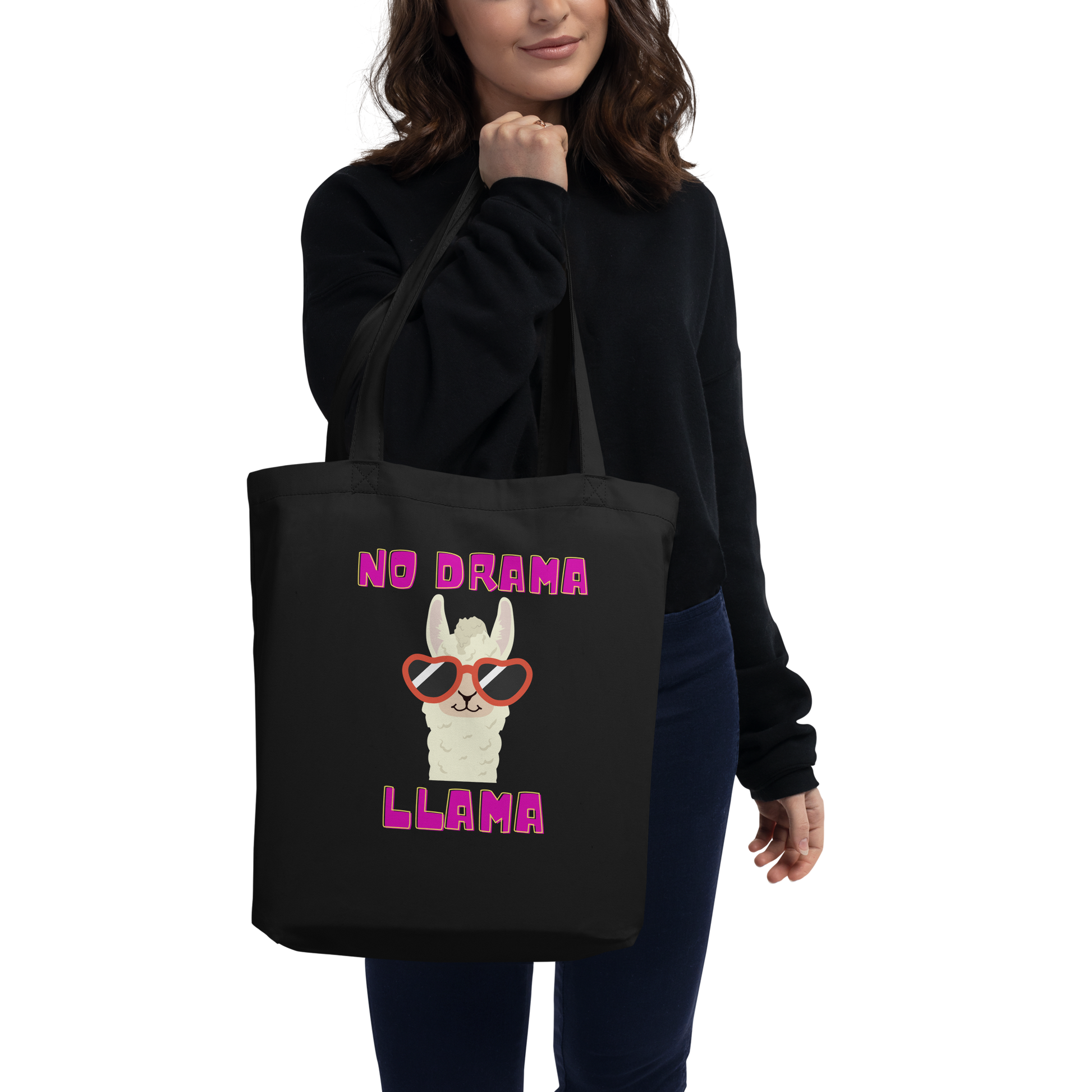 Introducing our stylish Black Cotton Tote Bag, featuring the playful and fun slogan 'NO DRAMA LLAMA'. Perfect for those who appreciate a touch of humor in their daily essentials. The tote bag showcases a charming graphic of a llama wearing sunglasses, adding a unique and quirky twist to your accessory collection. Made from durable cotton, this bag is ideal for everyday use, whether for shopping, carrying books, or just a casual day out. Its roomy interior and sturdy handles make it both practical and fashionable for all your carrying needs.