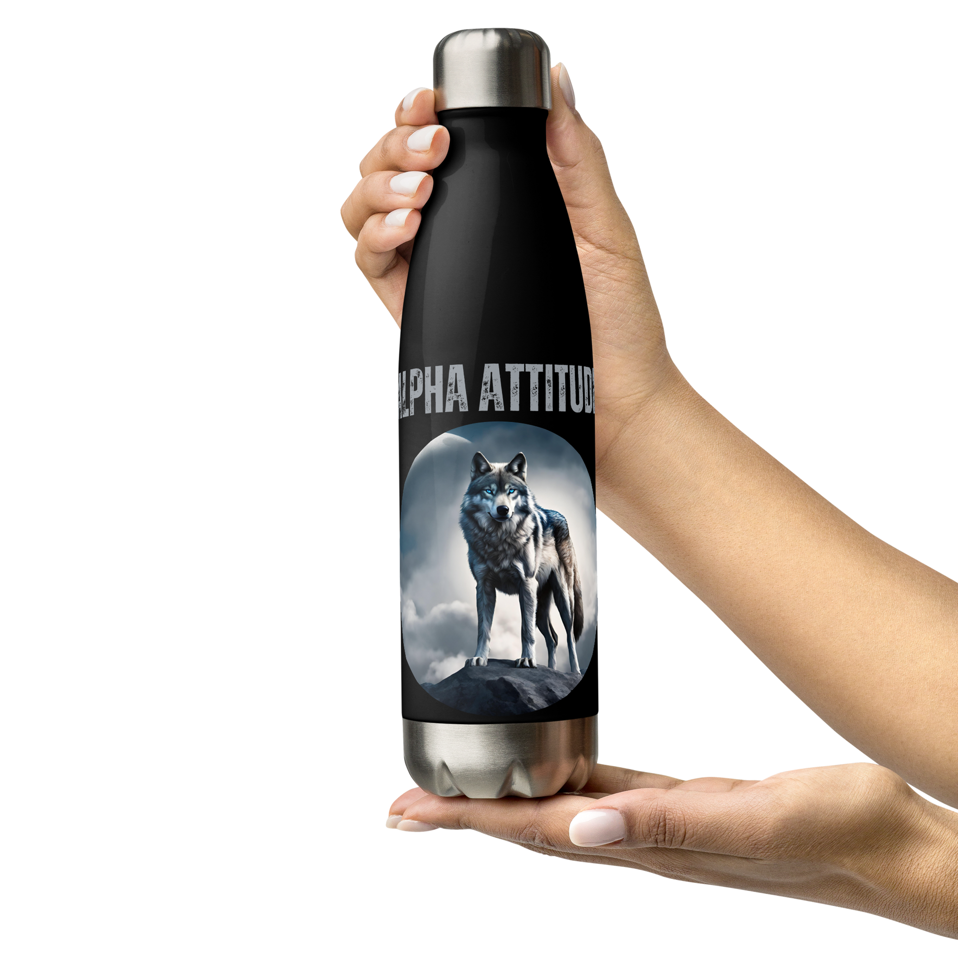 Elevate your hydration game with the "ALPHA ATTITUDE" stainless steel water bottle. This isn't just a water bottle; it's a testament to those who lead with strength and vision, featuring the iconic image of a blue-eyed wolf atop a moonlit mountain—every alpha's companion.