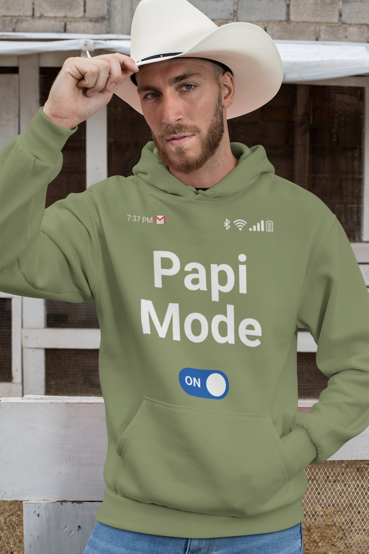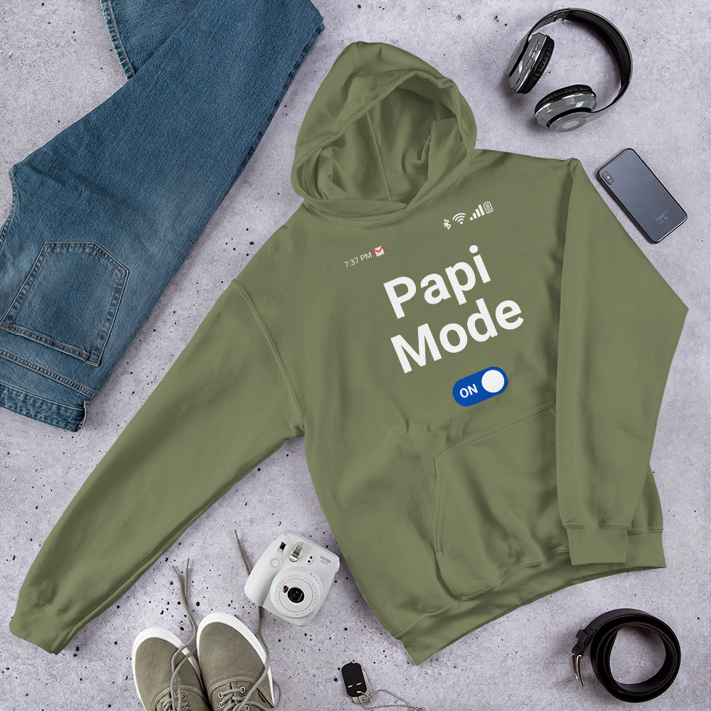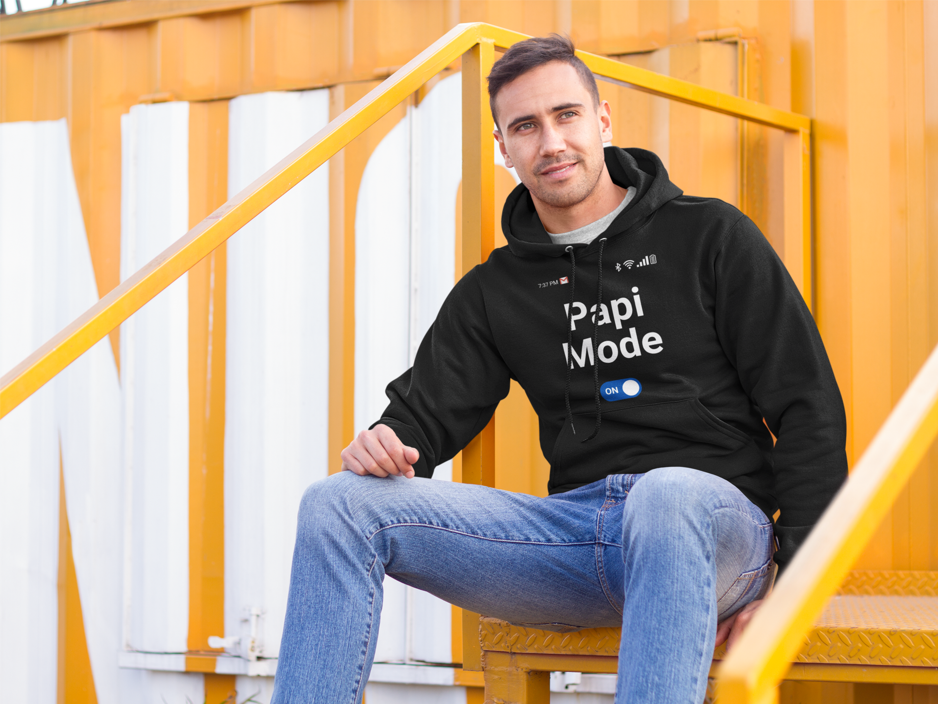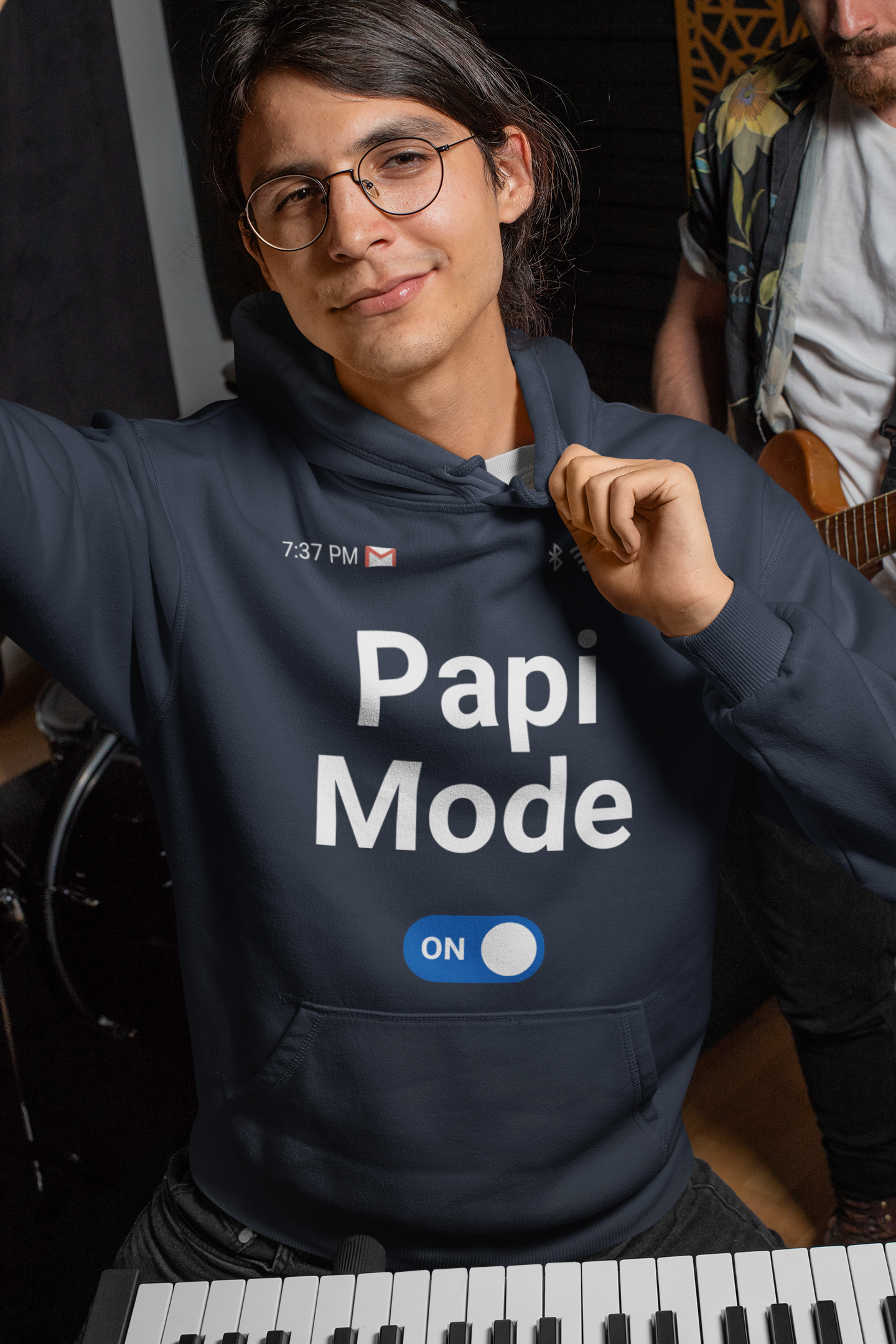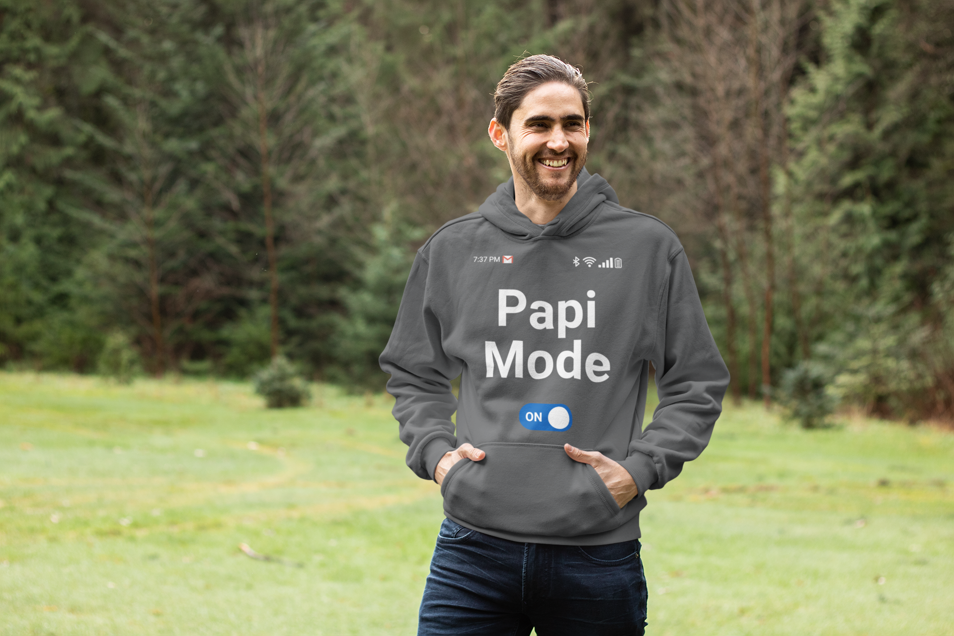 🎉 Unique Design: Engage in a fun tech-play with the "Papi Mode On" slogan, cleverly imitating a mobile interface, ensuring you're not only wearing a hoodie but also sporting a smile!