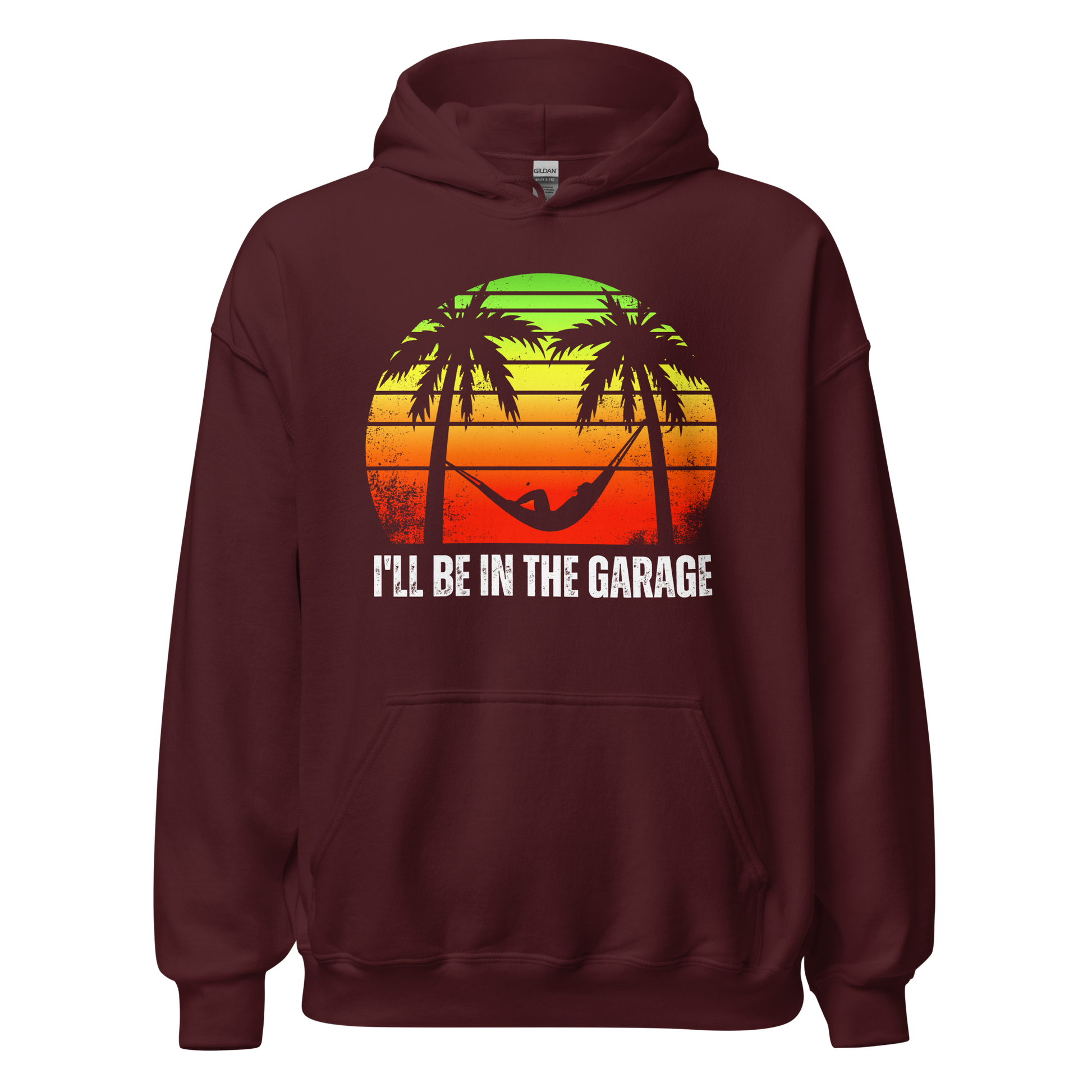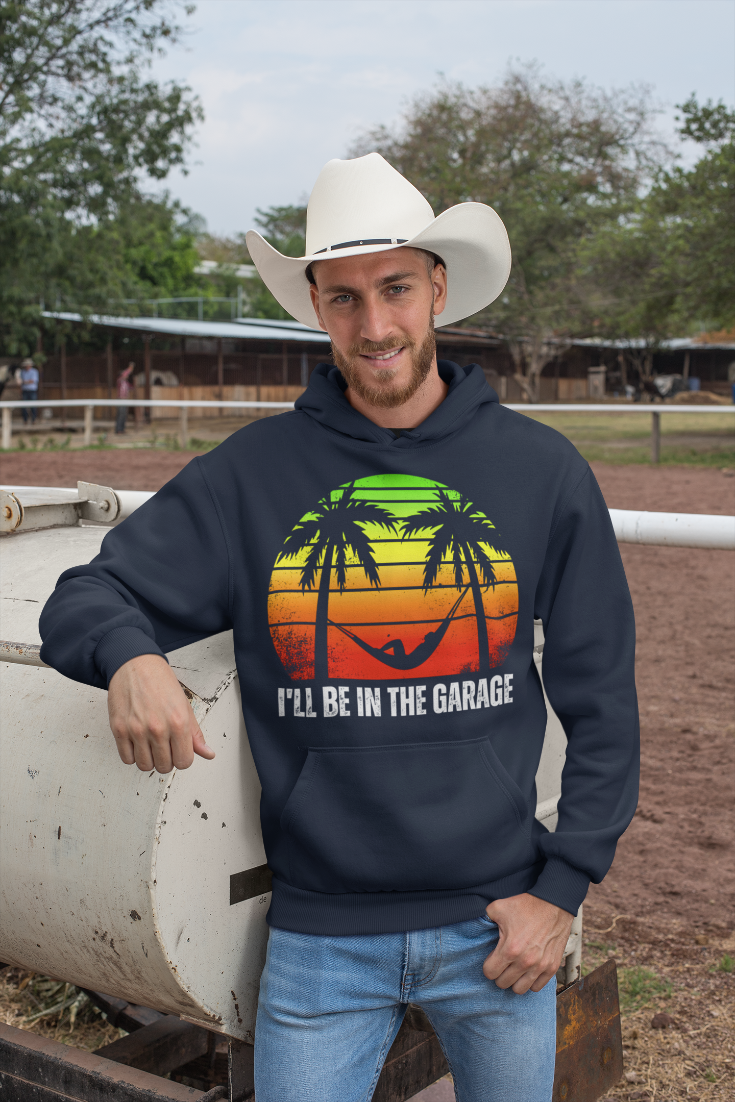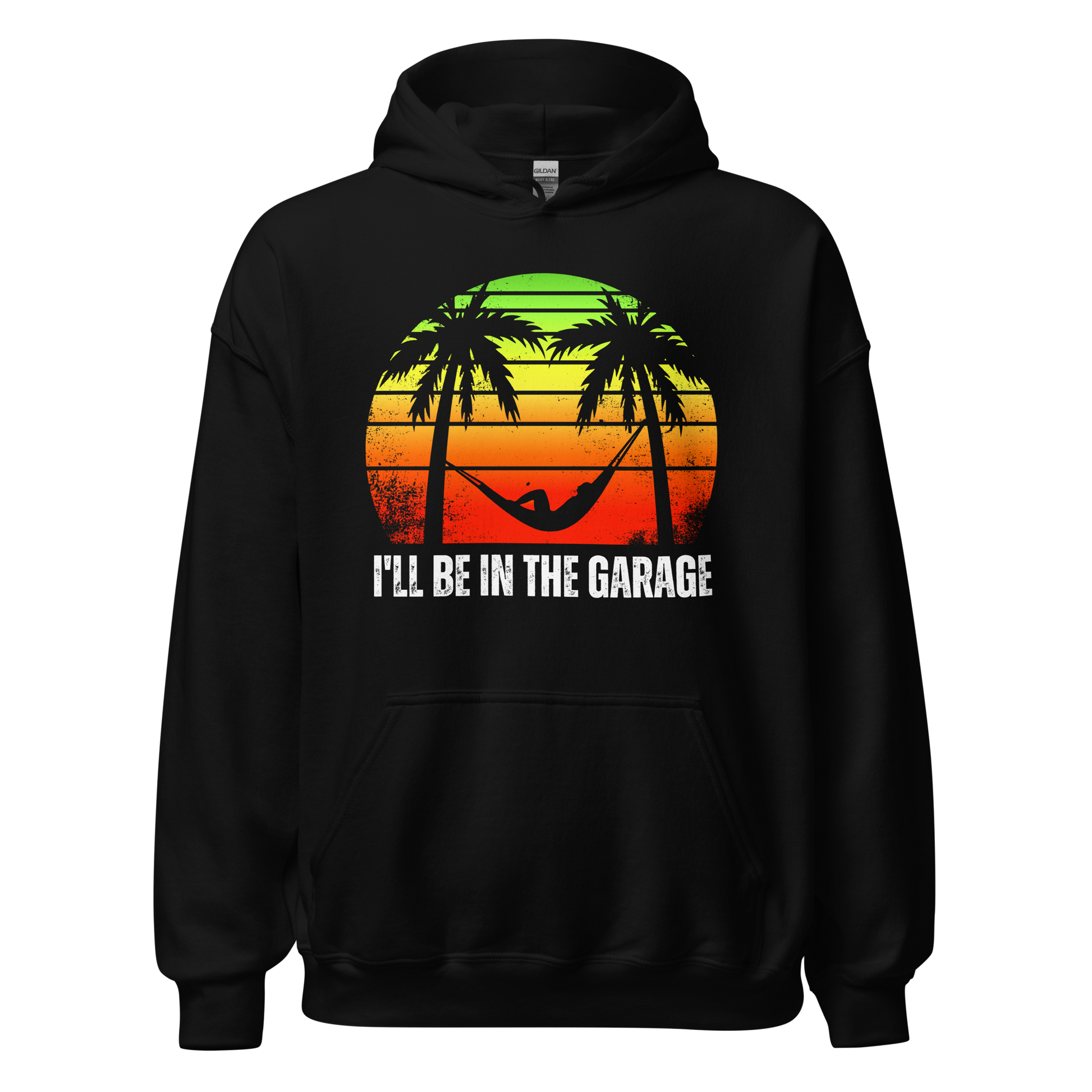 Embrace your downtime with our "I'LL BE IN THE GARAGE" hoodie. Whether you're a weekend warrior in the workshop or simply savoring some quiet time, this hoodie with its relaxed retro sunset, palm trees, and a serene hammock scene is your go-to garment.