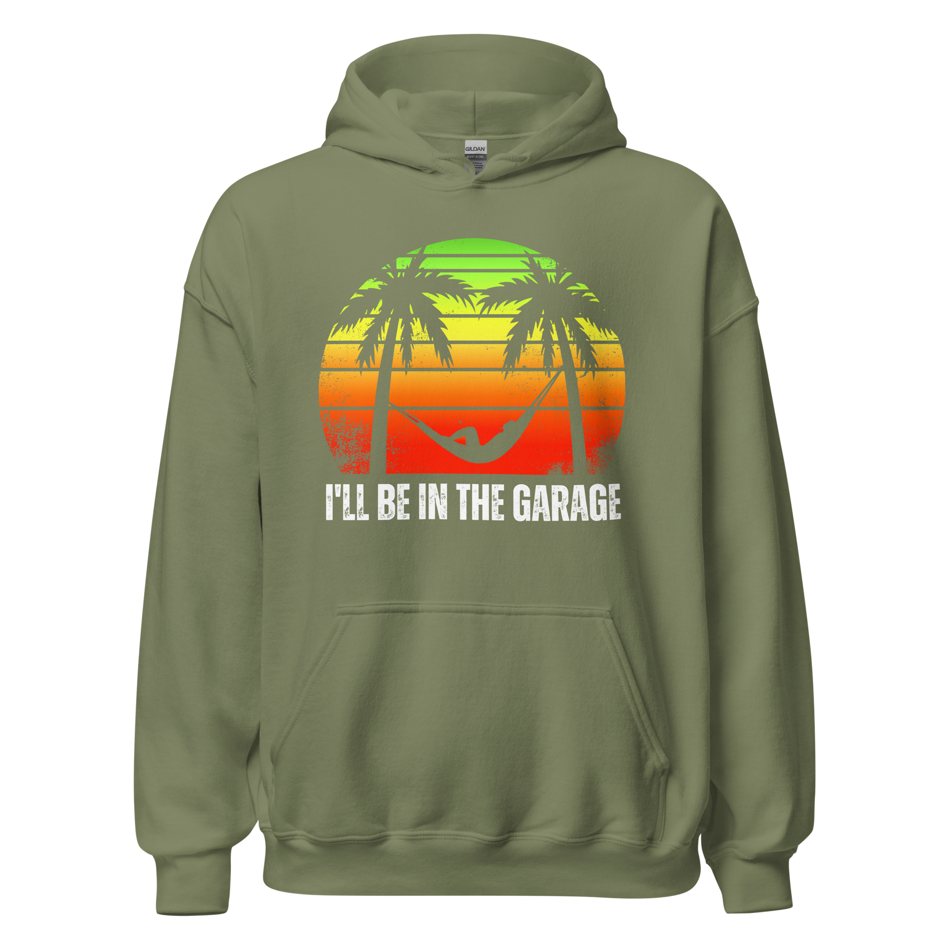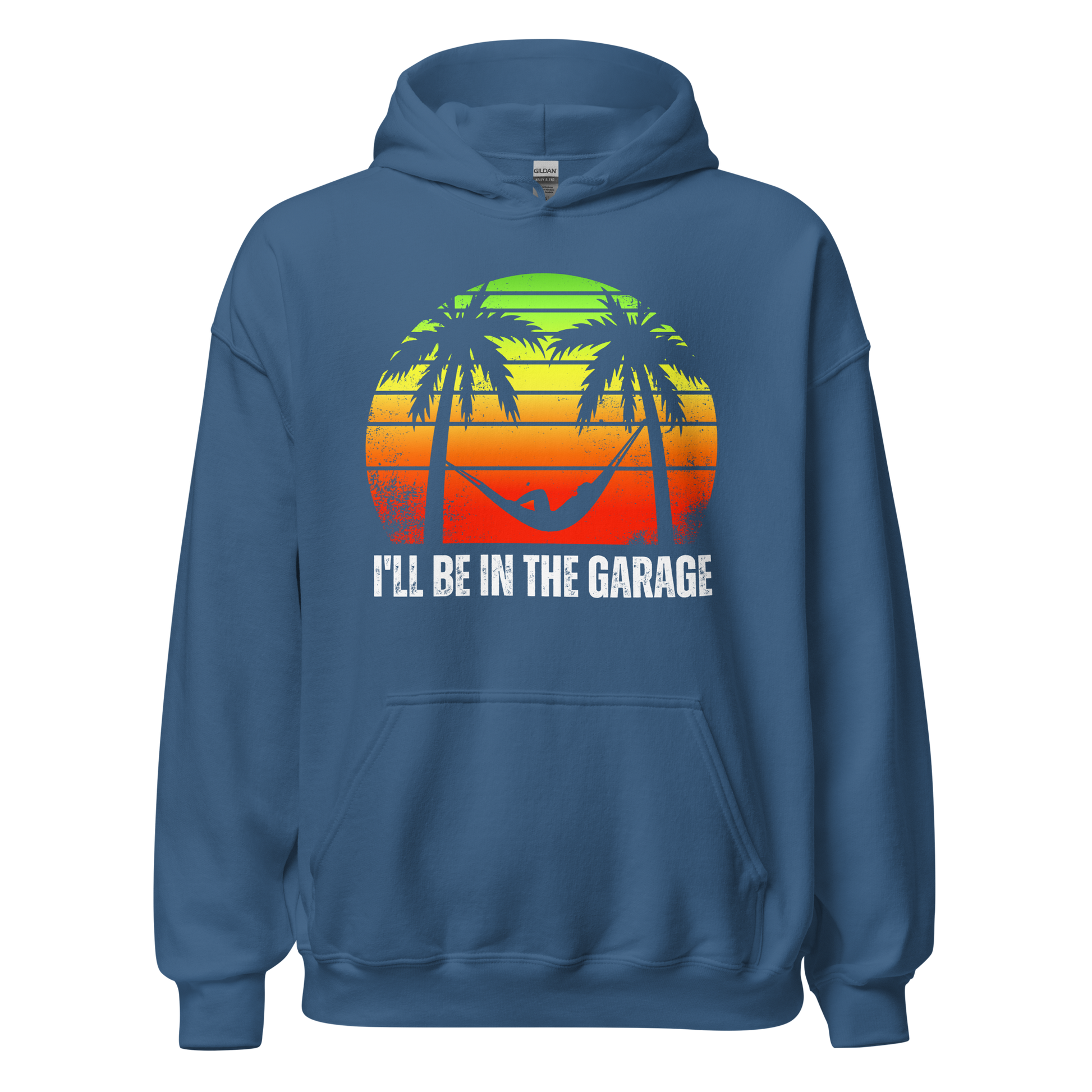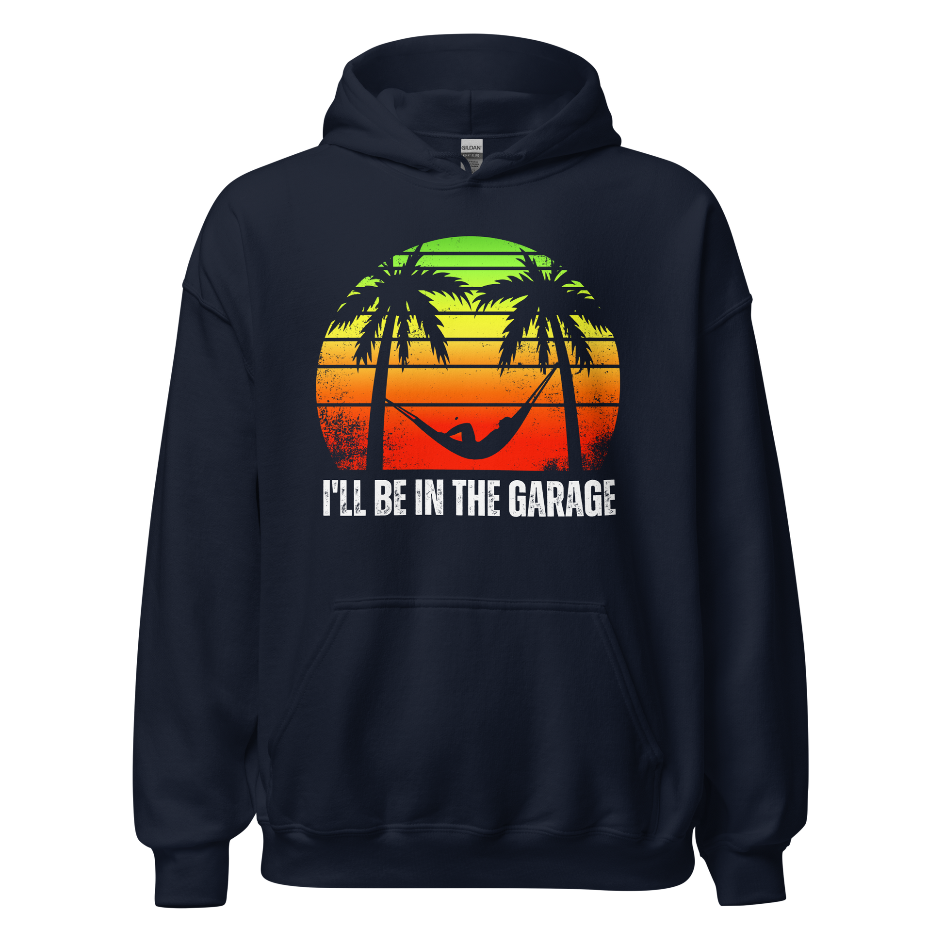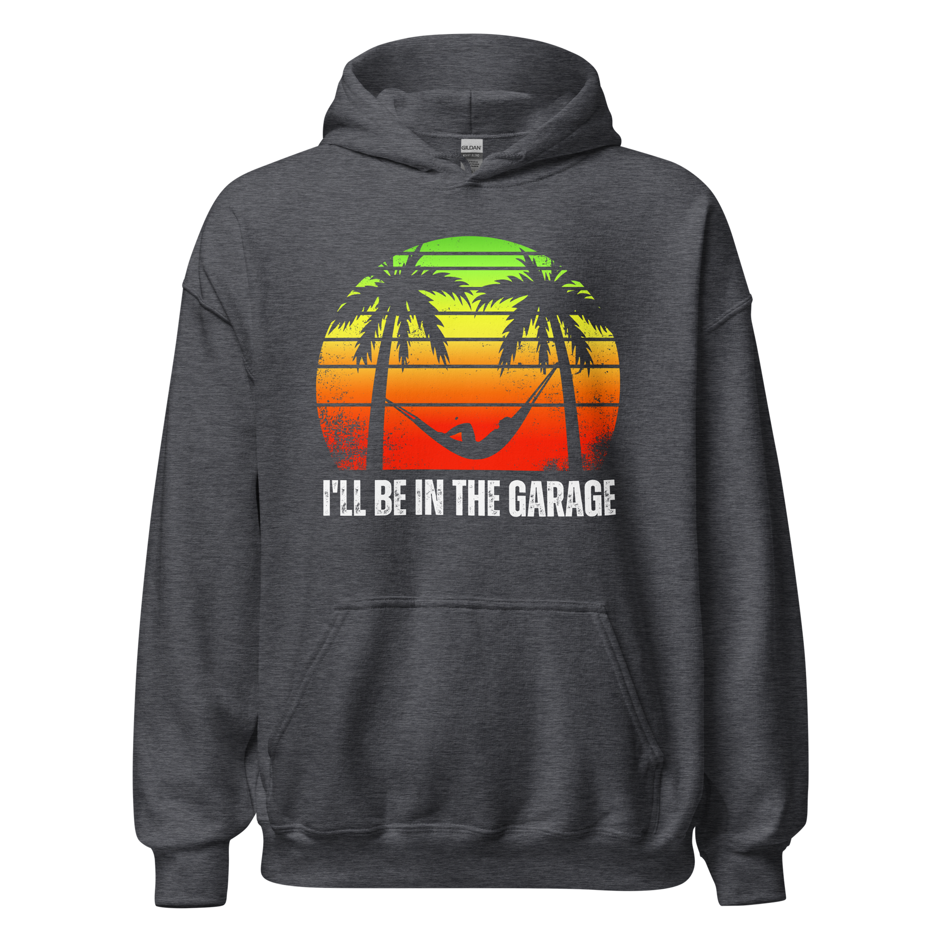 Embrace your downtime with our "I'LL BE IN THE GARAGE" hoodie. Whether you're a weekend warrior in the workshop or simply savoring some quiet time, this hoodie with its relaxed retro sunset, palm trees, and a serene hammock scene is your go-to garment.
