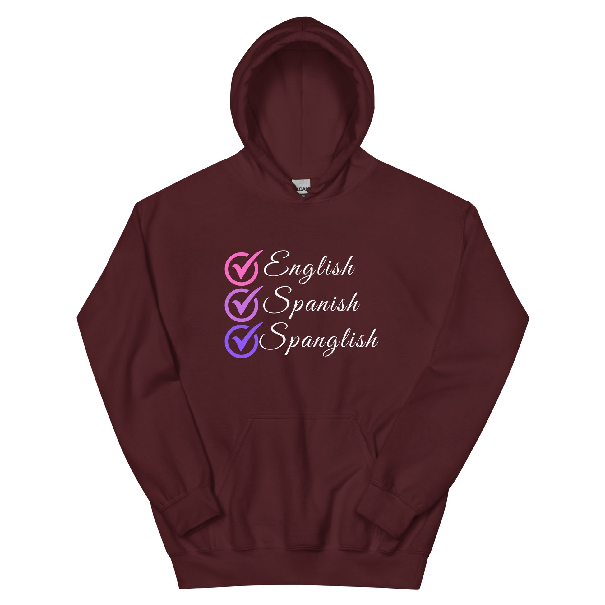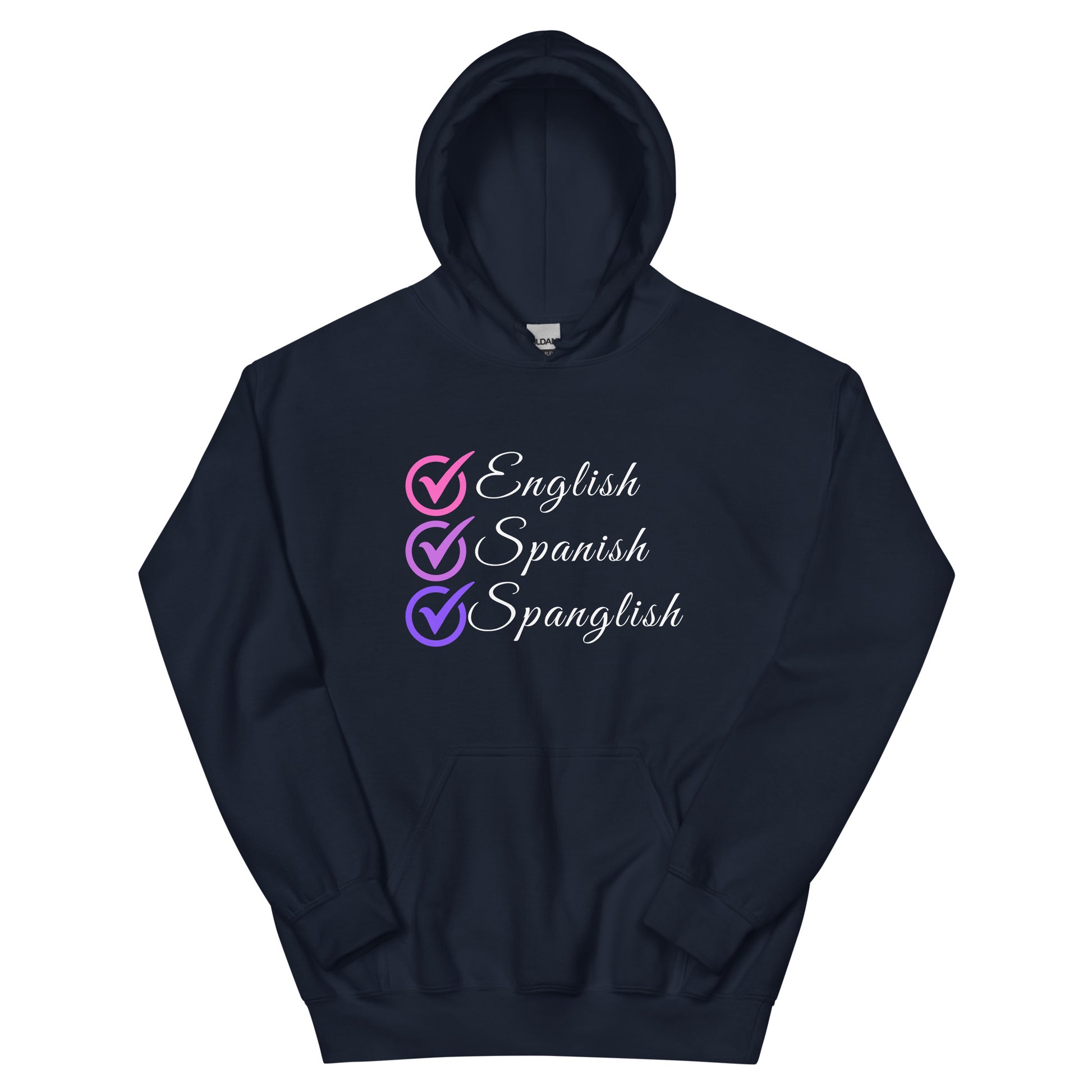 The "English, Spanish, Spanglish" design is a testament to the power of language and cultural fusion. It represents the harmonious blend of English and Spanish, creating the unique and vibrant Spanglish dialect. Wear this hoodie proudly and showcase your love for language diversity.