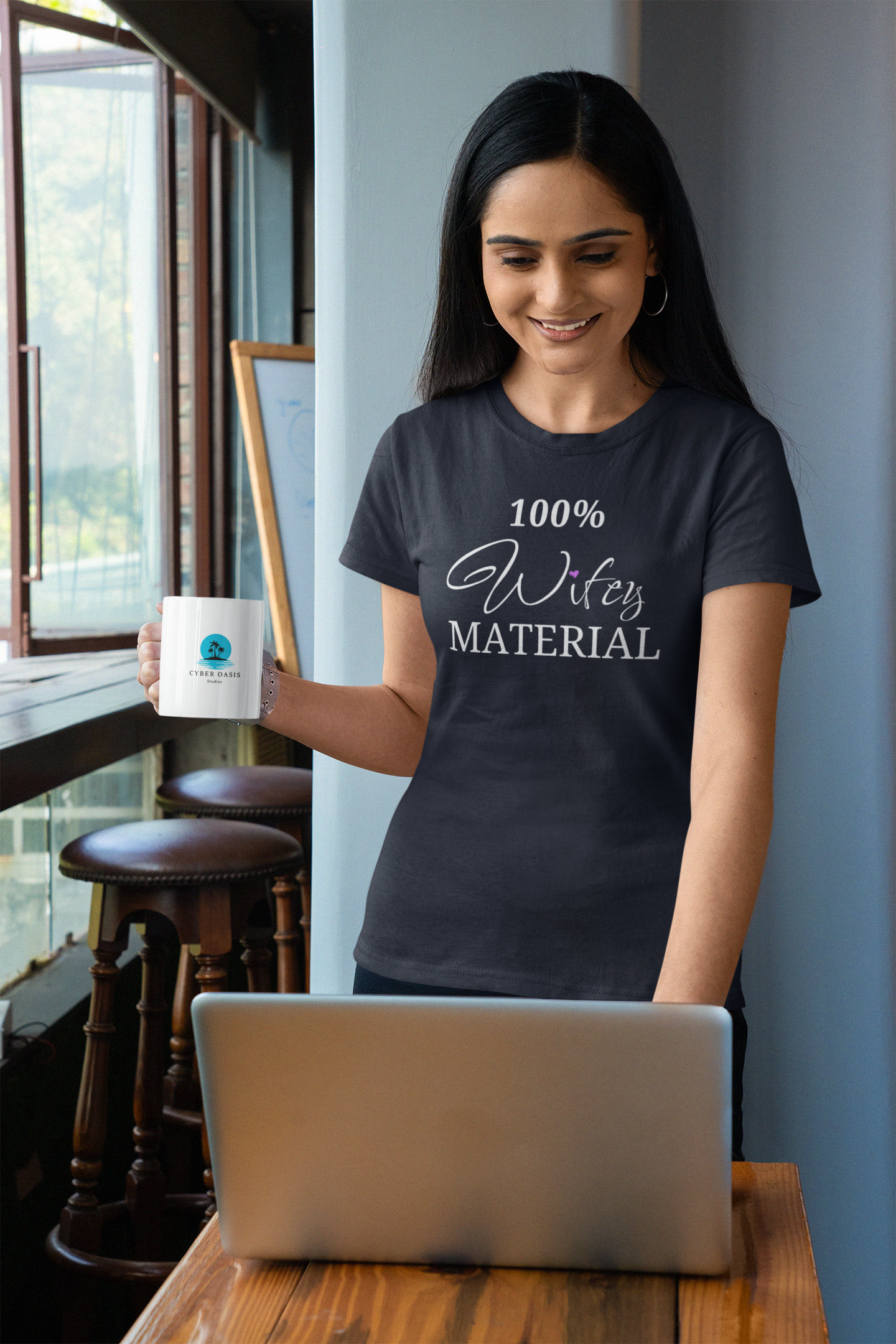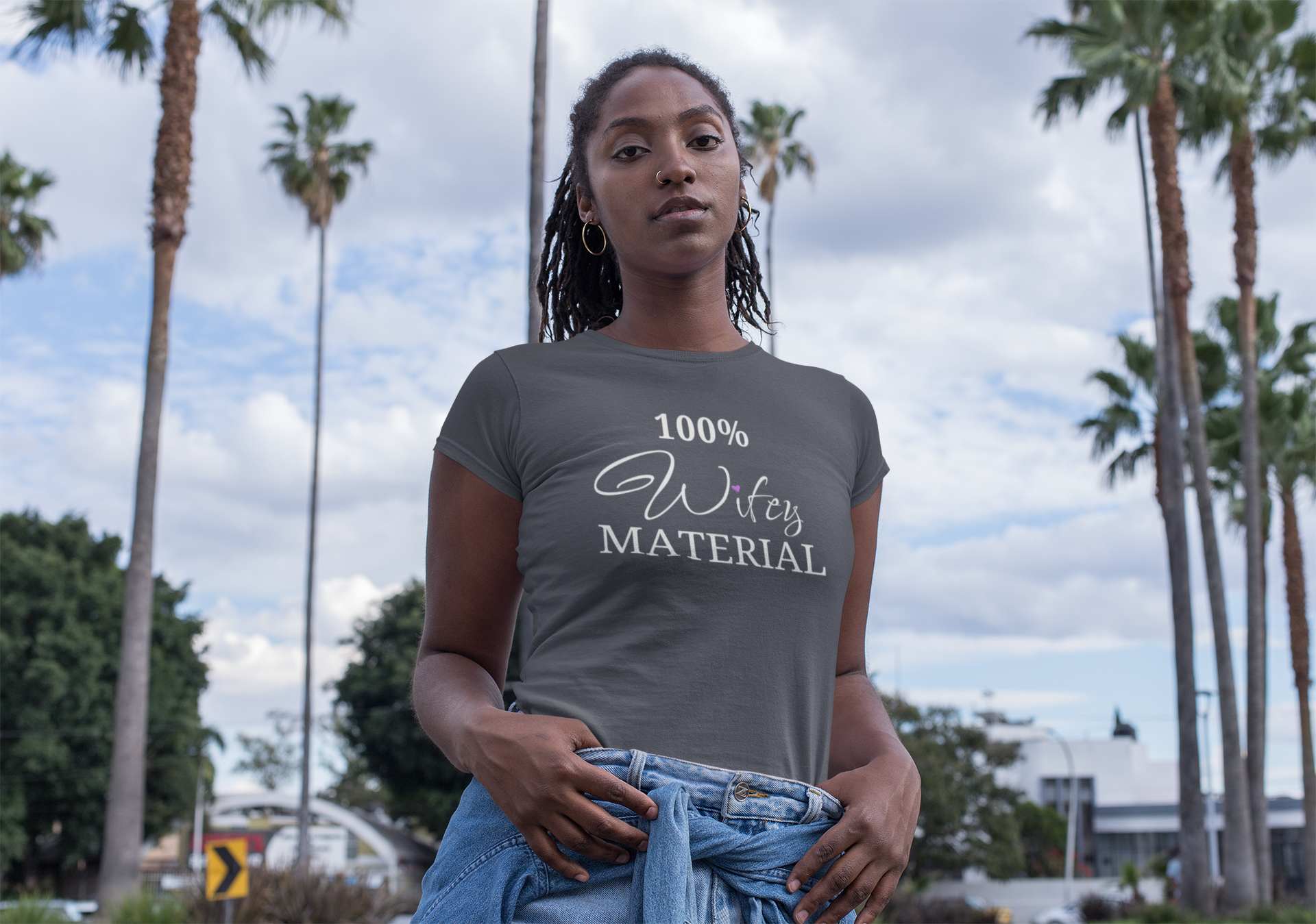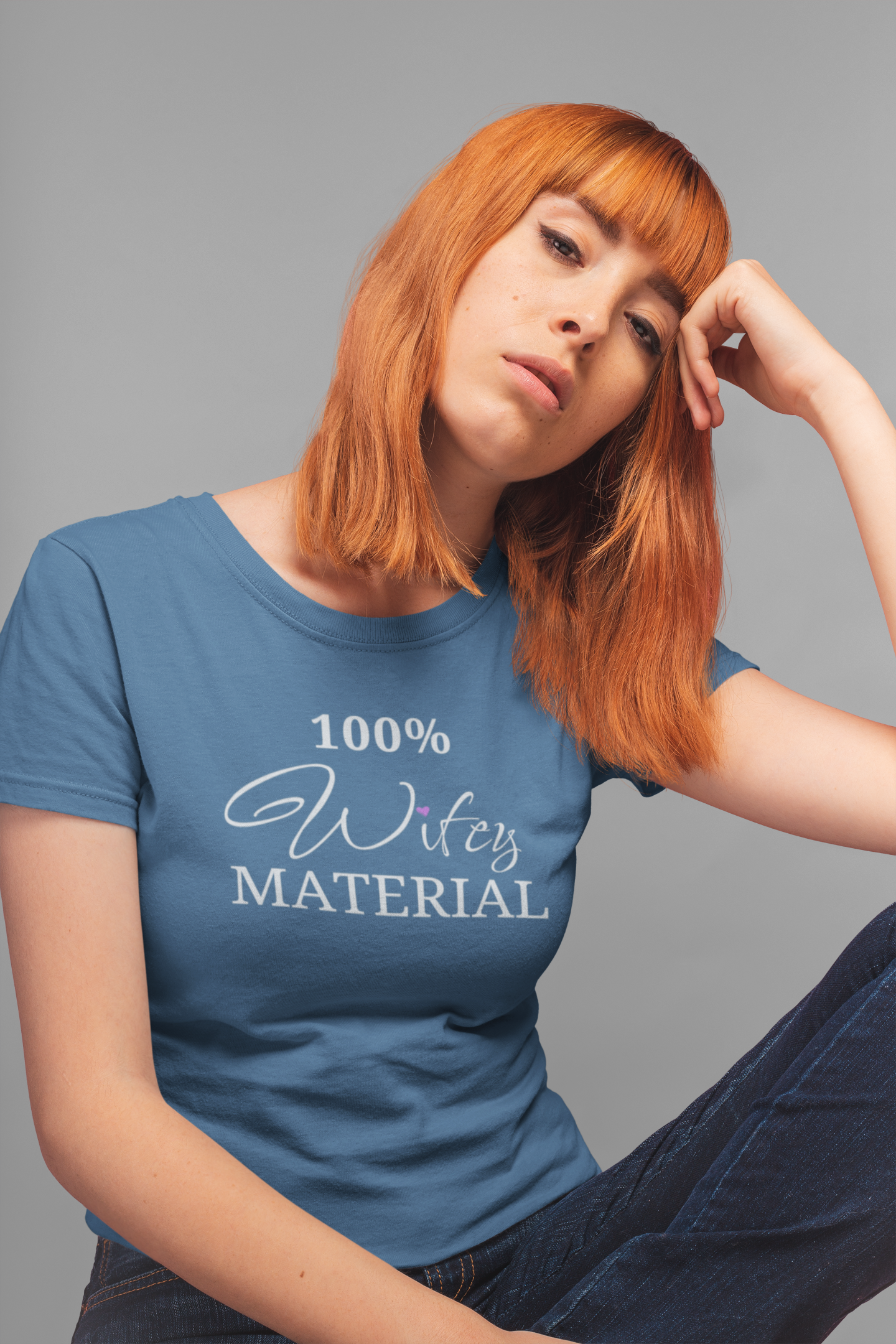 The "100% Wifey MATERIAL" design is a bold statement of your dedication and love for your partner. Wear it with pride and let the world know that you are a strong and confident woman who embraces her role as a wife.