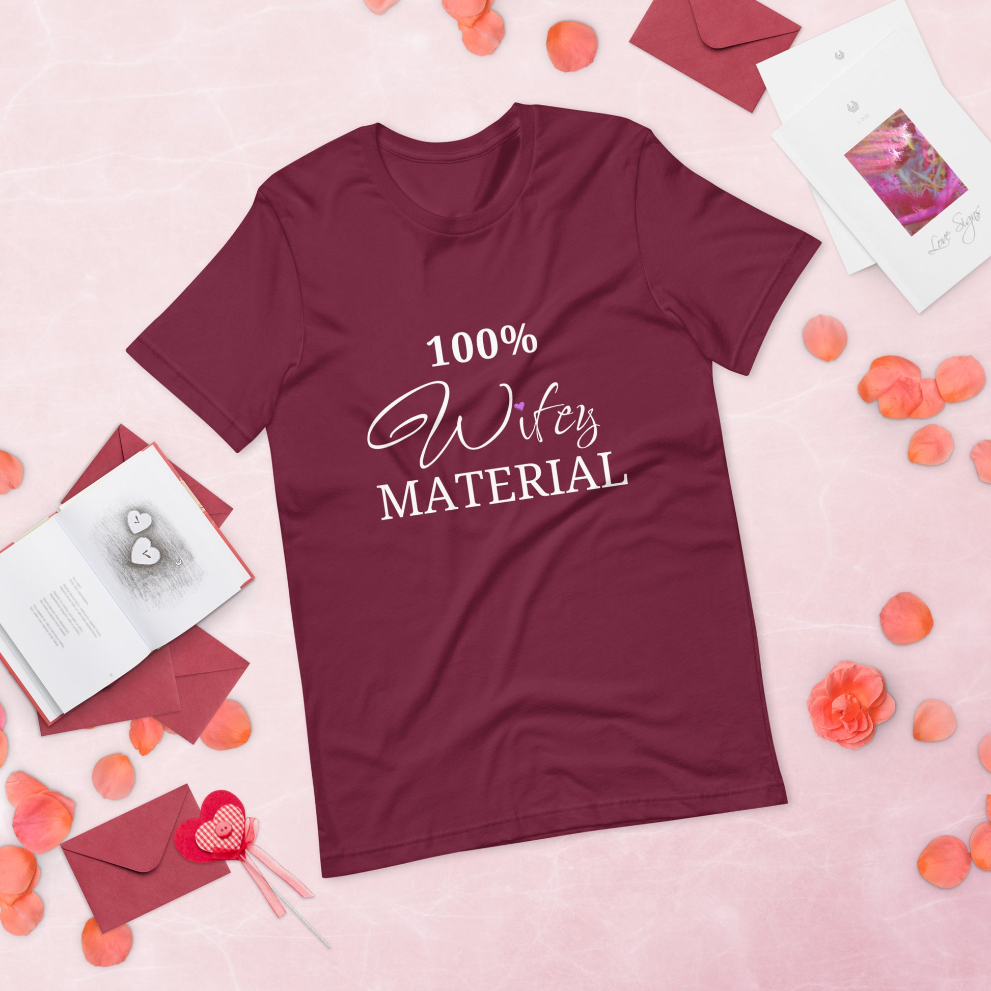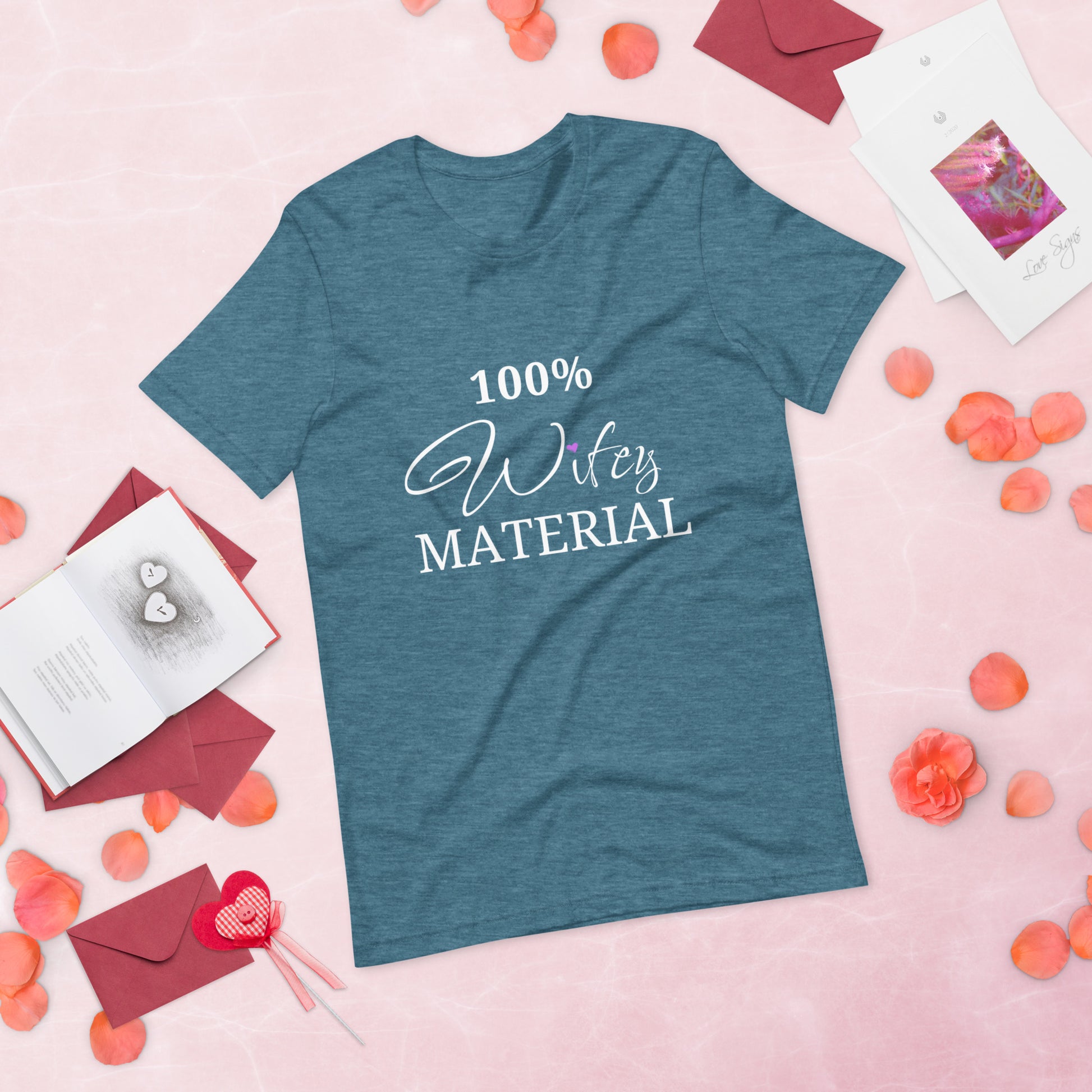 Embrace your wifey status with style and confidence in our Women's Premium Tee Shirt. Order now and let the world know that you are "100% Wifey MATERIAL.”