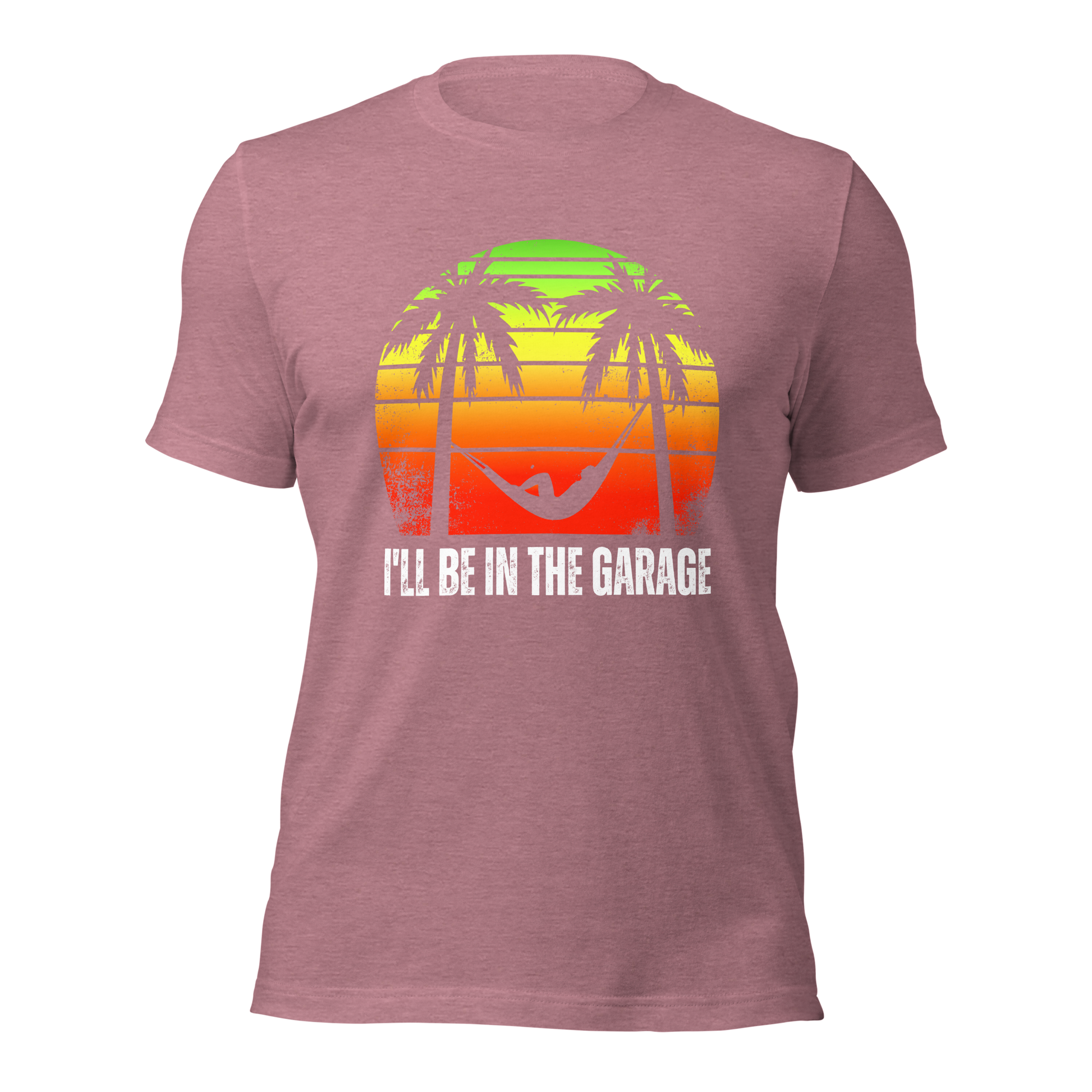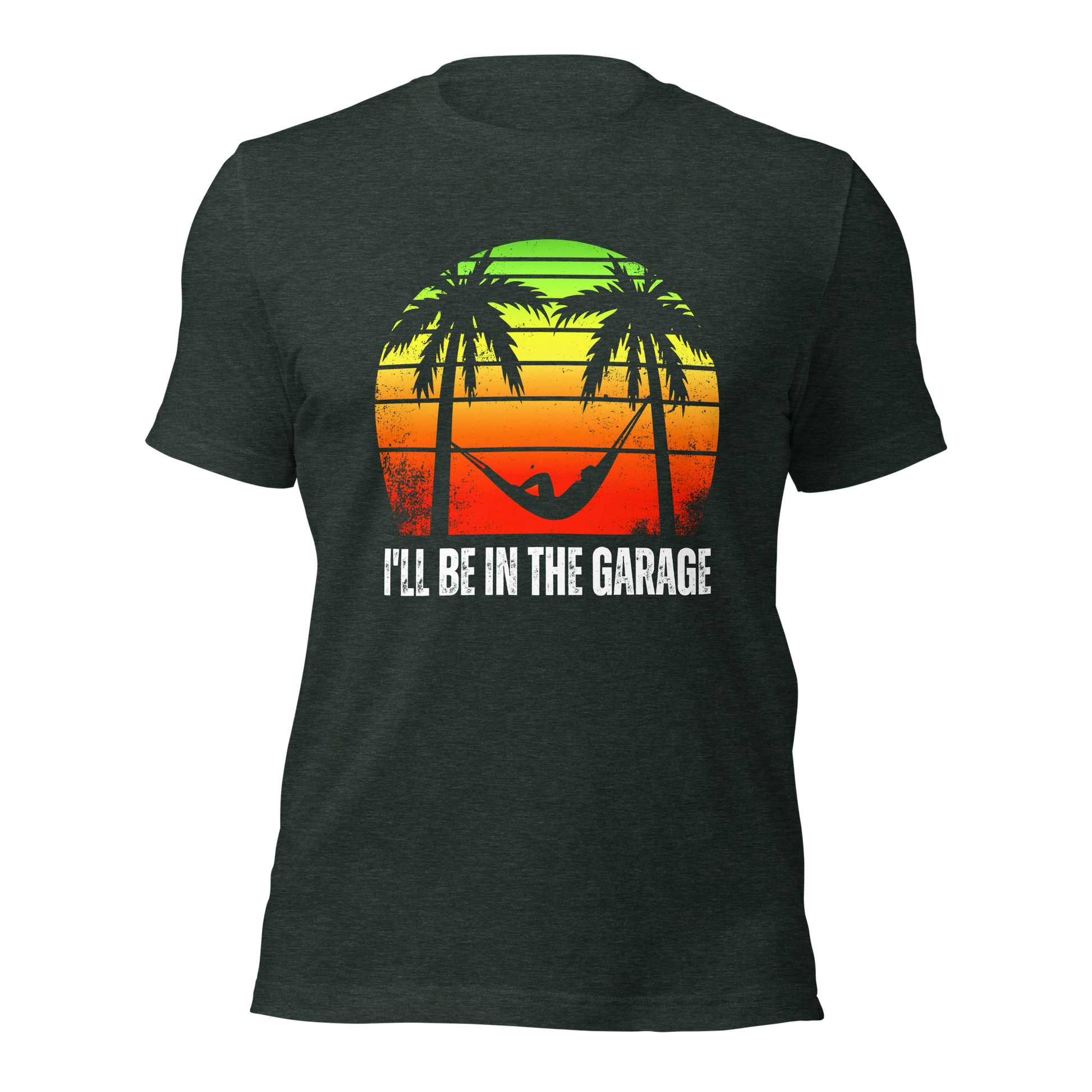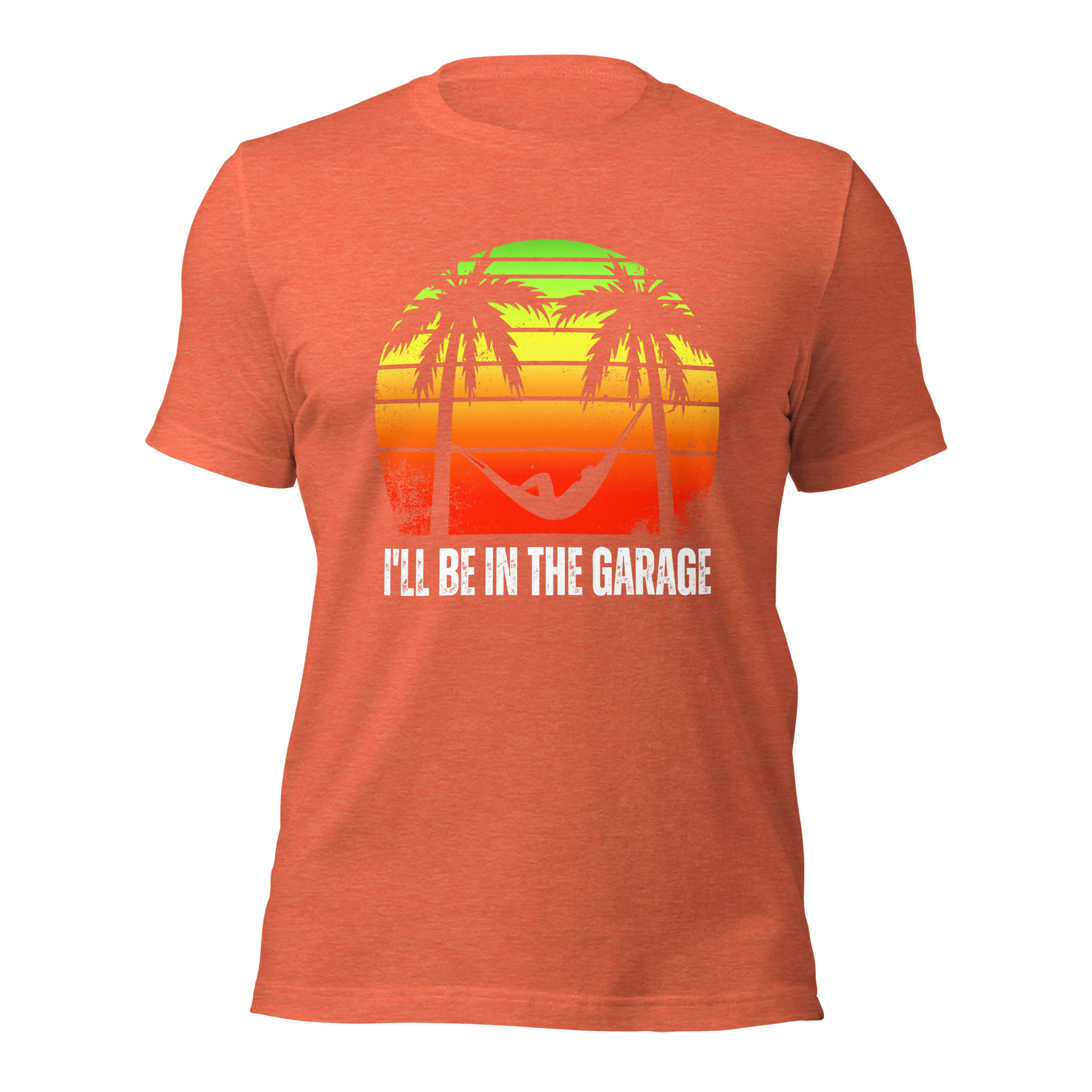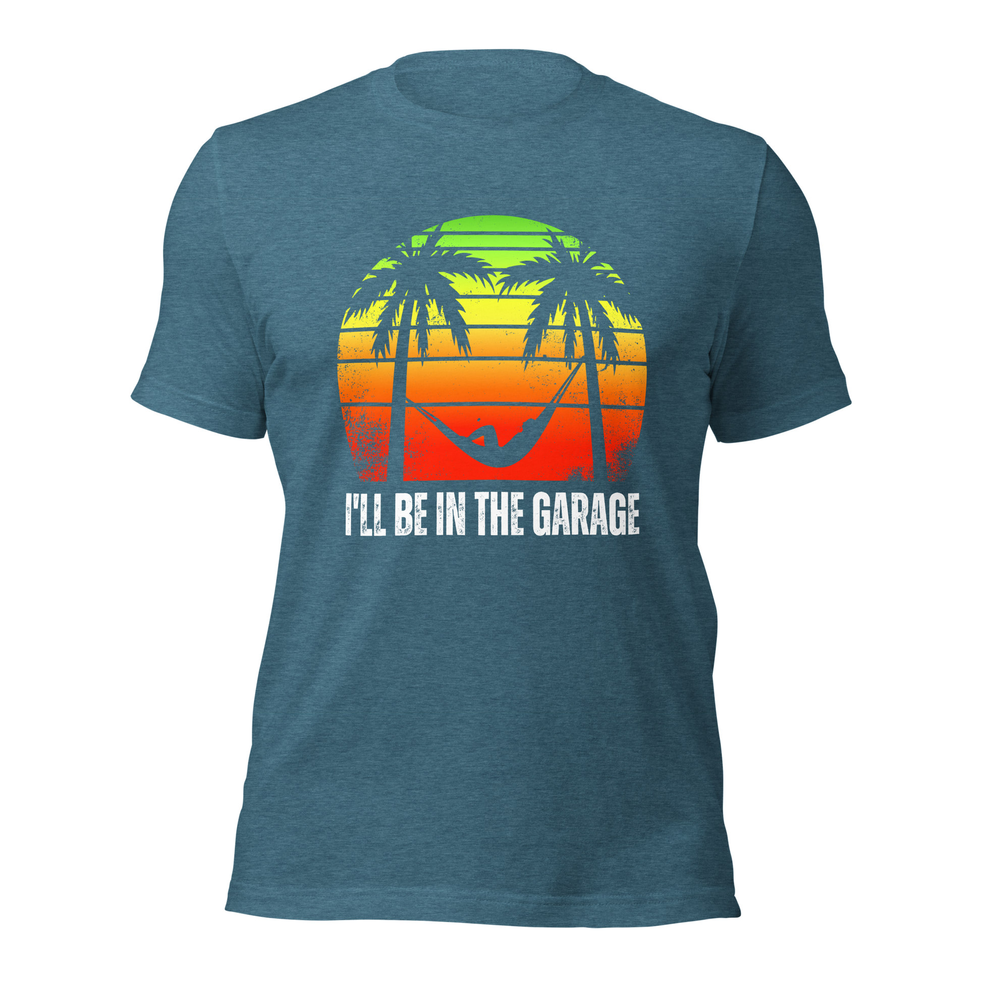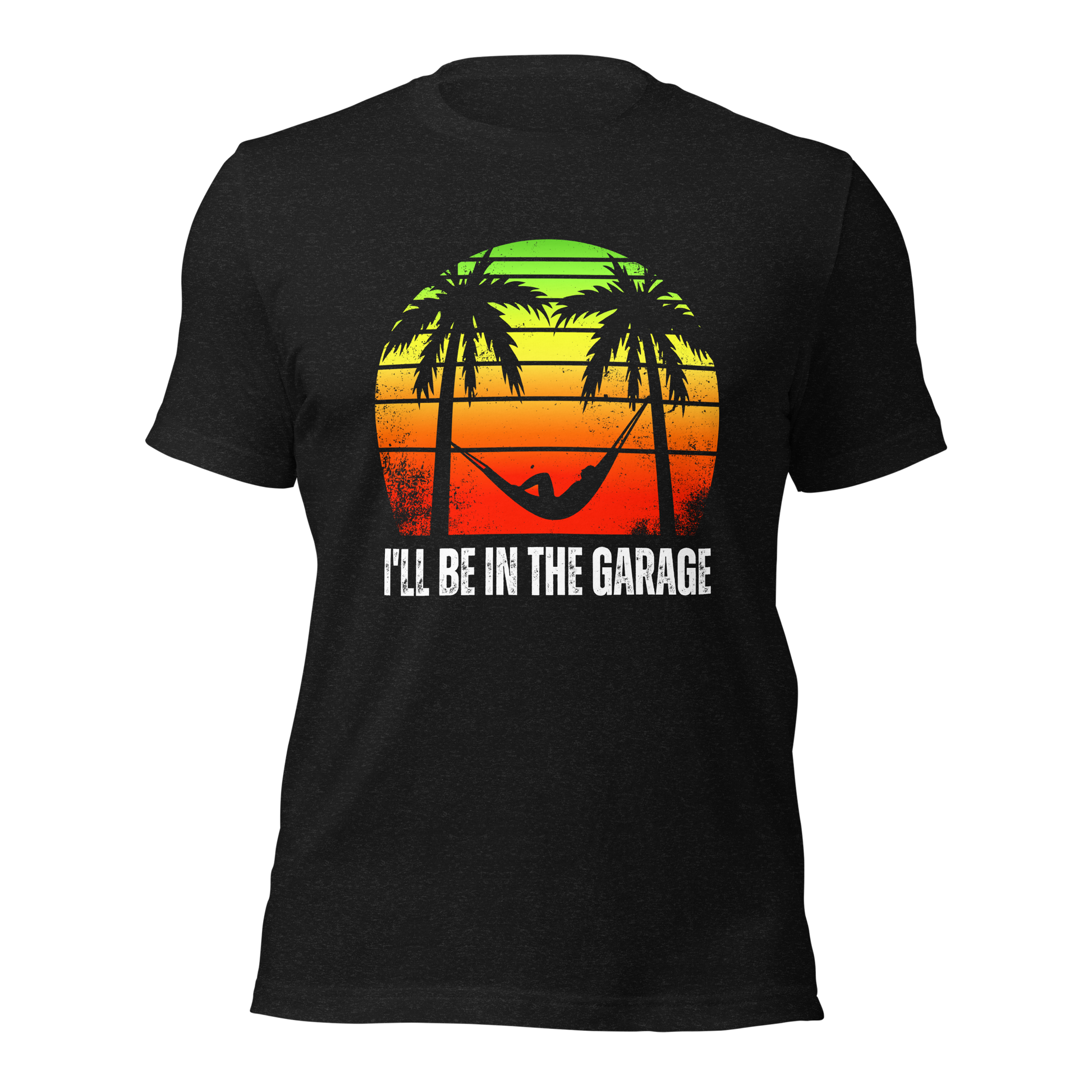 Introducing the ultimate tee for the man who finds paradise in the garage. Adorned with a laid-back hammock scene set against a retro sunset, our "I'll Be in the Garage" shirt is for those who speak the language of leisure and tools.