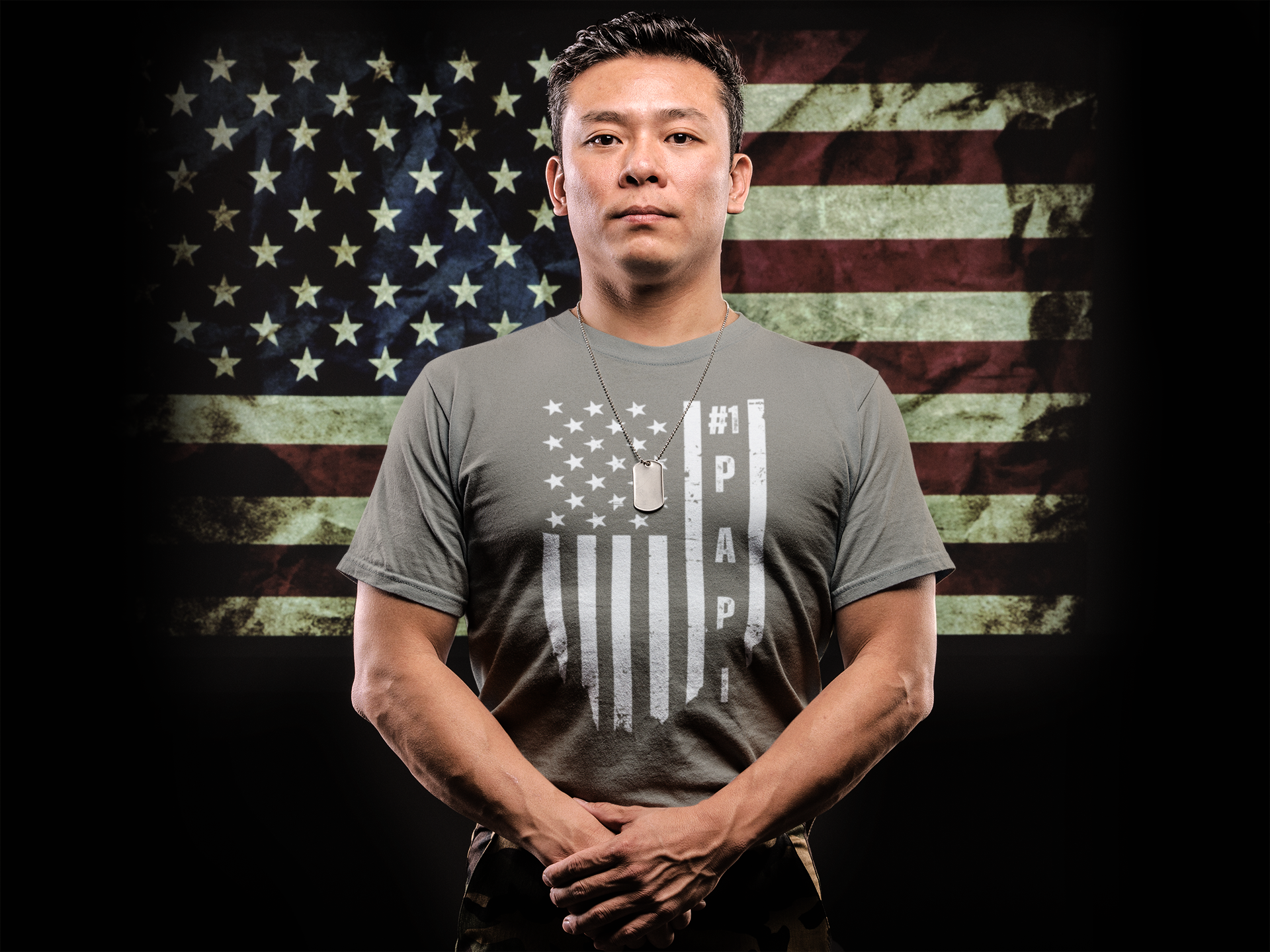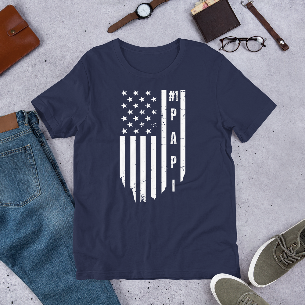 Men's #1 Papi Designer Tee | Faded American Flag Background | Patriotic Father's Day Gift