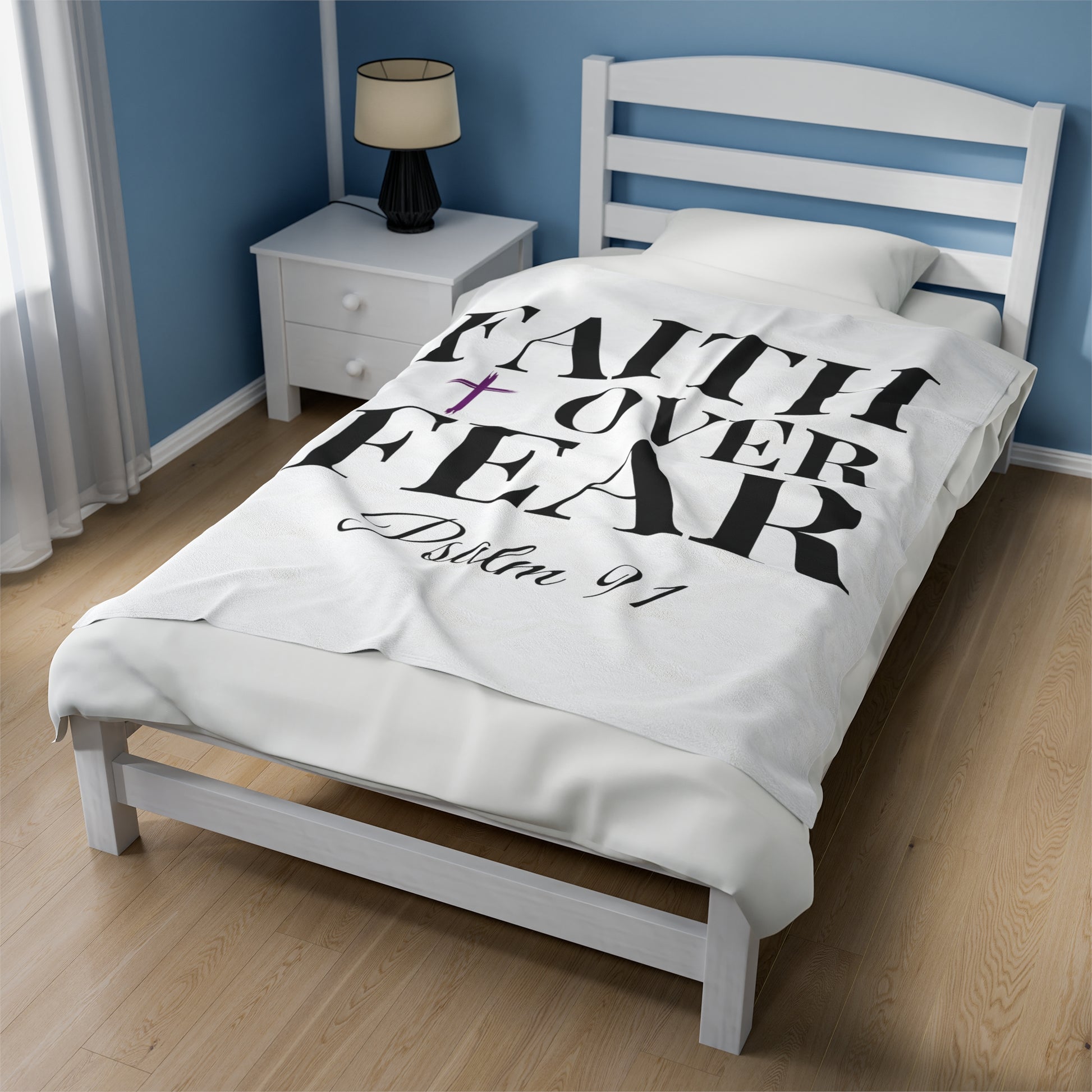 Introducing our plush velveteen blanket – a serene haven for those who live by faith. This 50" x 60" blanket, adorned with the powerful words "FAITH over FEAR" and "Psalm 91," is designed not just to provide physical warmth but also to offer a source of spiritual comfort and resilience.